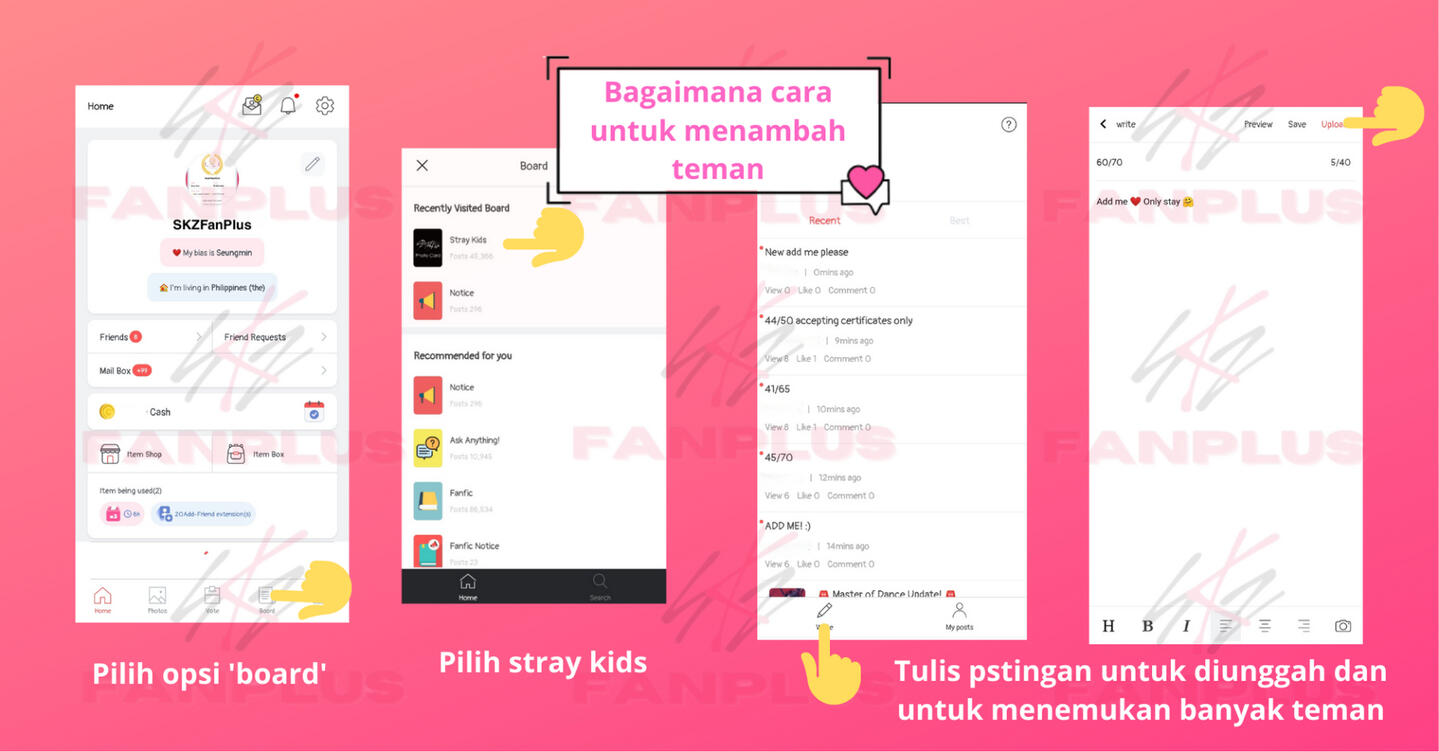 MENAMBAHKAN BANYAK TEMAN(Dapatkan banyak teman dengan memposting pada papan SKZ sehingga yang lainnya dapat menambahkan anda sebagai teman! Atur gambar profil di sertifikat FanPlus sehingga stay yang lain tau kamu bisa dipercaya dan menambah anda sebagai teman~)